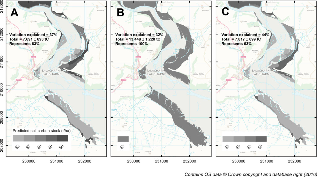 As well as using our research to develop The Saltmarsh App we have also made a predictive tool for use by specialist environmental organisations. That tool includes detailed maps of predicted carbon stocks in salt marshes (Figure 6). The tool and the maps can be downloaded as a pdf and GIS layer at [url TBC]. It is hoped that the App and the predictive tool will increase the general publics and environmental mangers understanding of the importance of biodiversity to the benefits we all get from our natural environment.