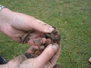 Figure 4. The soil roll test; taking a soil sample and attempting to roll it into a worm will give an indication of soil type. If you roll a silvery looking ‘worm’ more than 3 mm wide, that breaks apart easily, it is likely to be a sandy soil. A ‘worm’ 3 mm wide or less that holds together well would suggest a clay-silt soil. If the soil contains more than 30% dead plant material and roots it is organic and no roll test is needed.